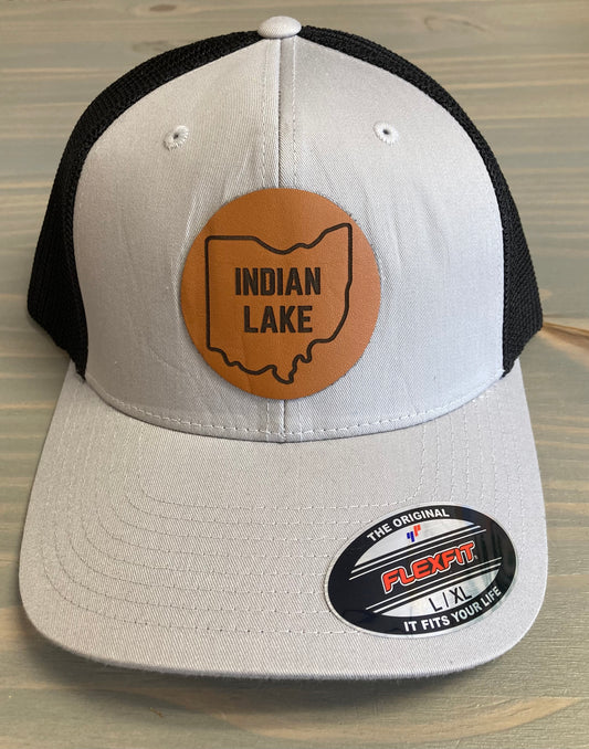 Indian Lake with Ohio Outline Leather Patch Flex Fit Mesh Ball Cap