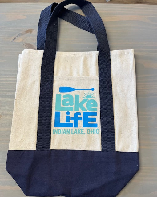 This versatile cotton tote has color block handles and bottom for on-trend style and a modern look. Decorated with Lake Life Indian Lake, Ohio makes it even more special!