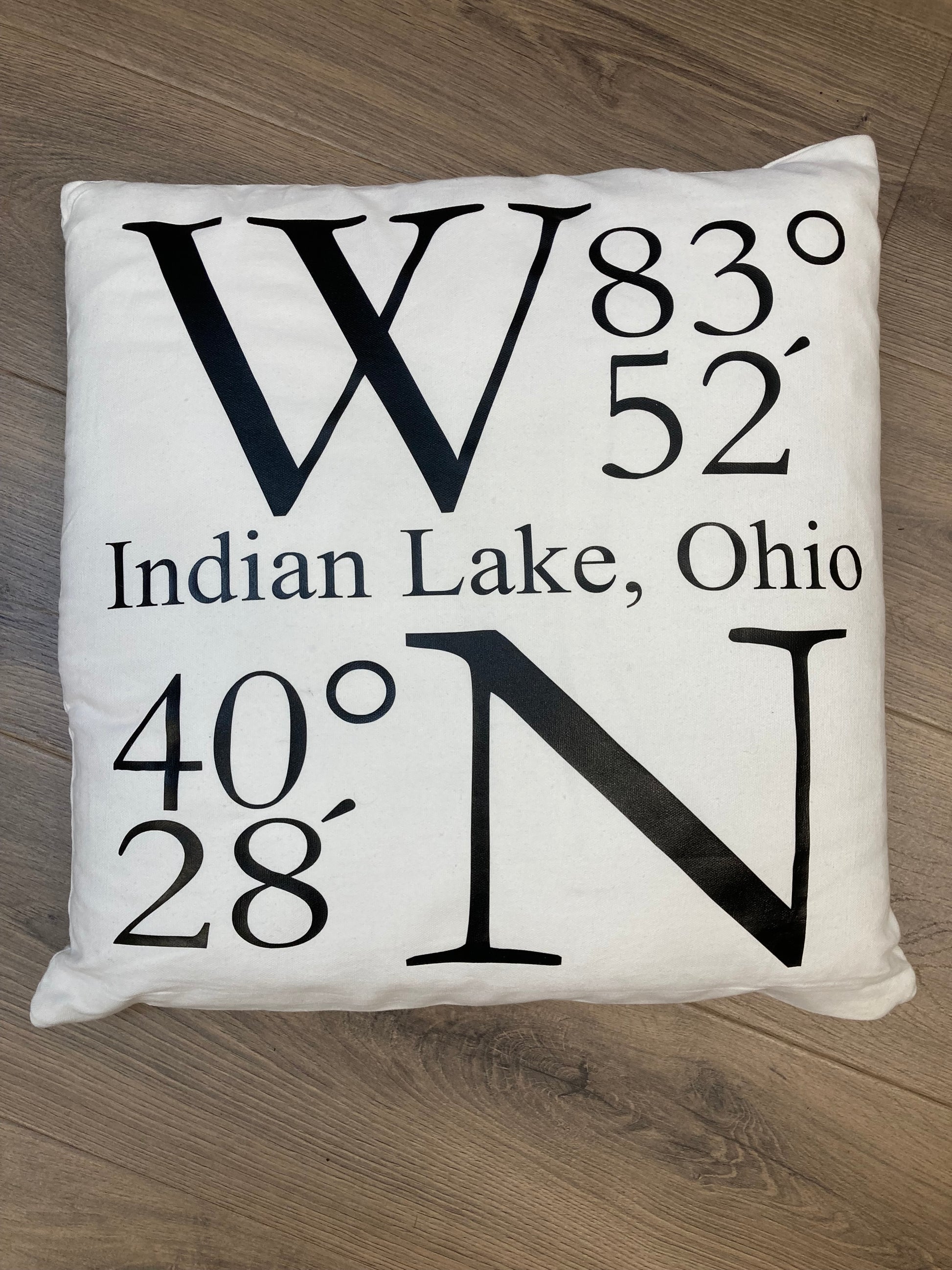 Show your love for Indian Lake with this 18 x 18 Indian Lake coordinates pillow.