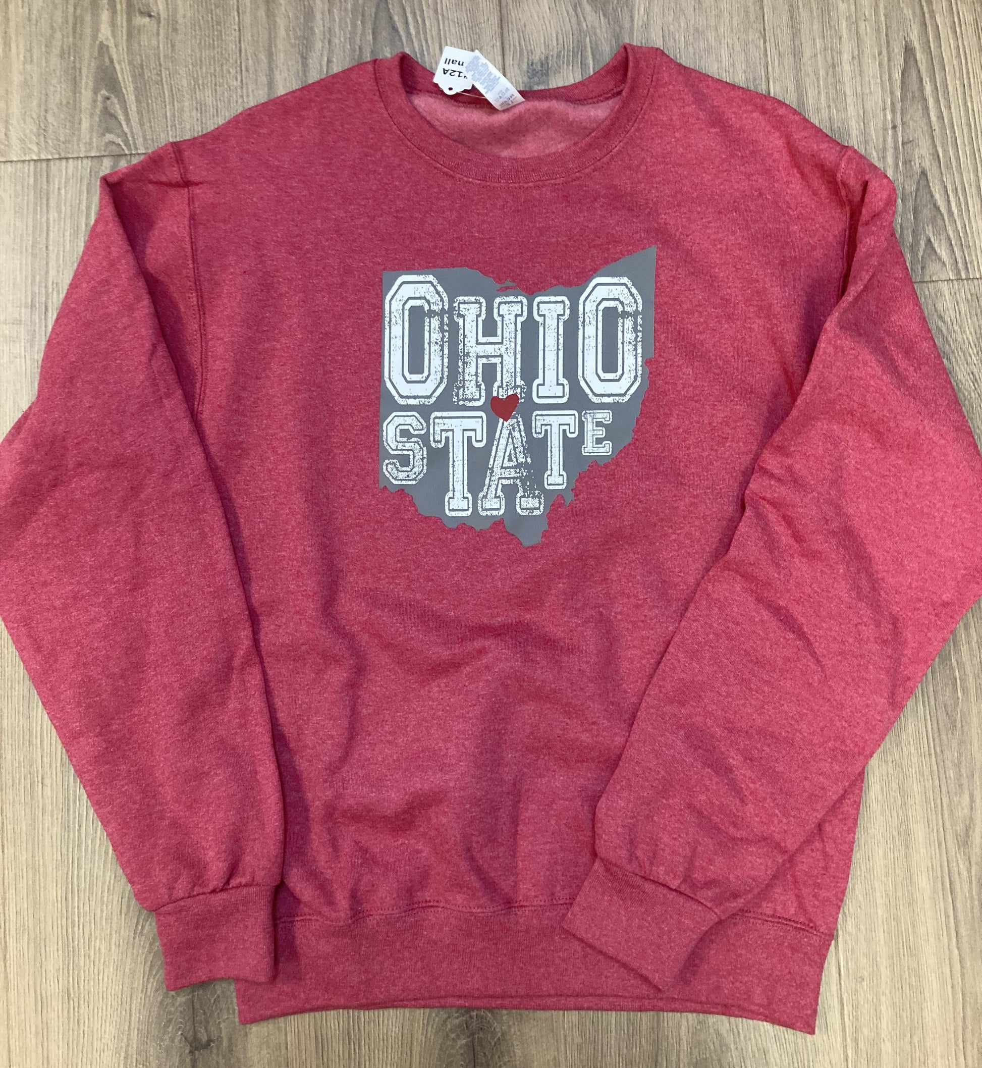 Show your love for Ohio State with this warm crewneck! It features a grey Ohio shape on a red crewneck with the words Ohio State in white and a heart in the center.